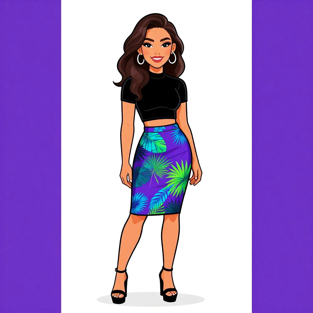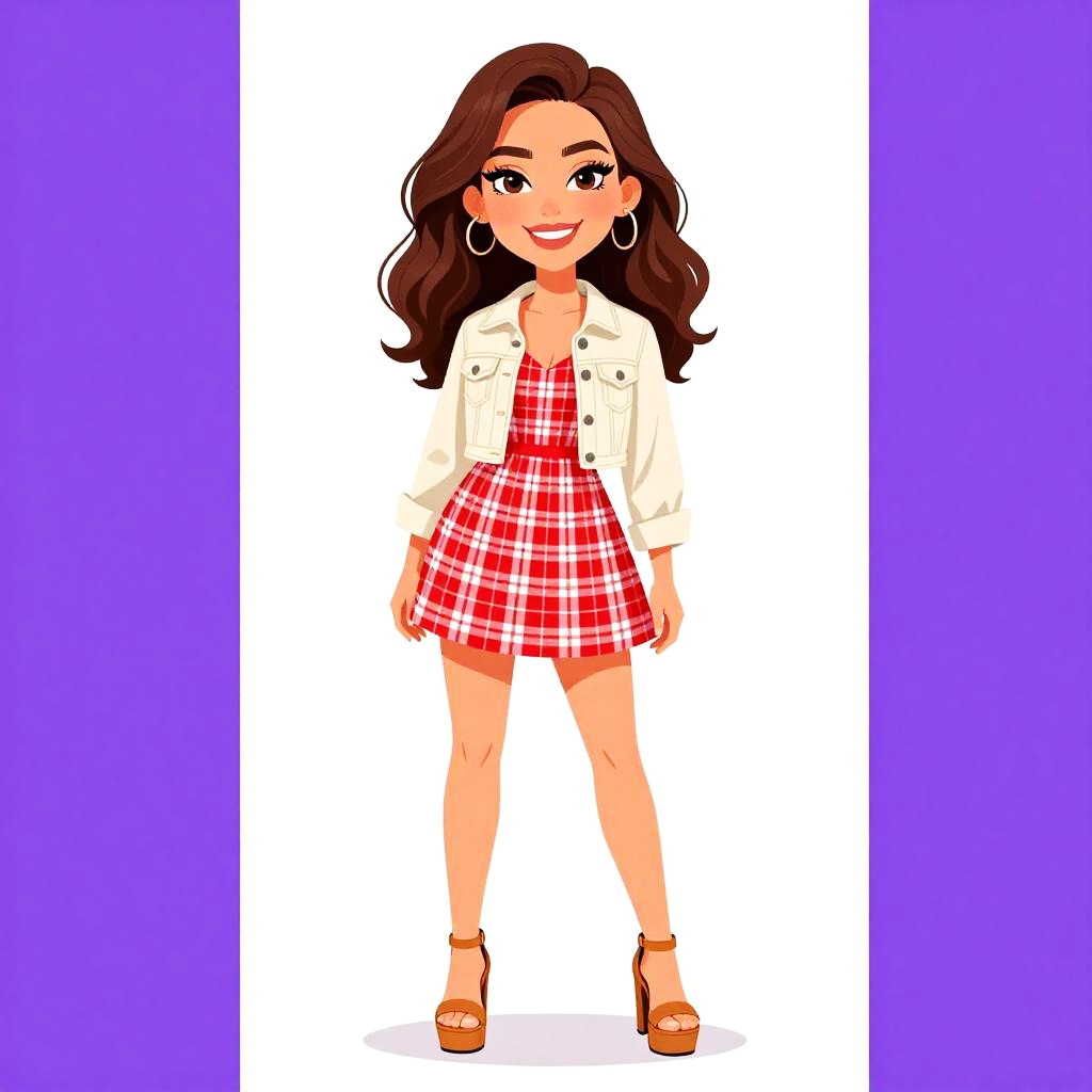 Digital illustration of a smiling young woman with brown hair, wearing a white floral halter dress, black ankle boots, standing against a white and purple background