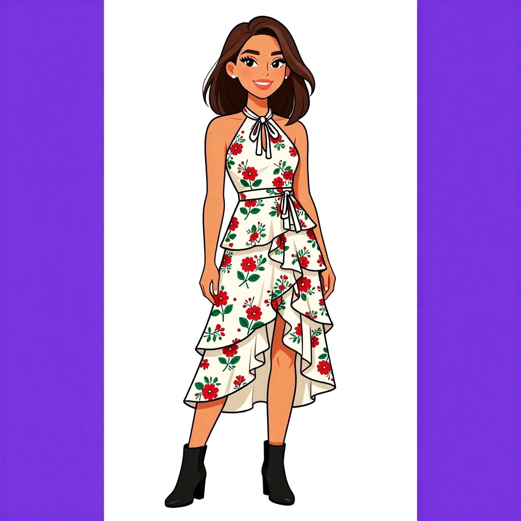 This is a digital drawing of a young woman with light brown skin and shoulder-length dark brown hair, smiling. She wears a sleeveless, white, floral halter dress with red and green flowers, a tied waist, and a asymmetrical hem. Her black ankle boots contrast with the dress. The background is white with purple vertical borders on either side. The drawing is done in a vibrant, cartoonish style with bold colors and clean lines.