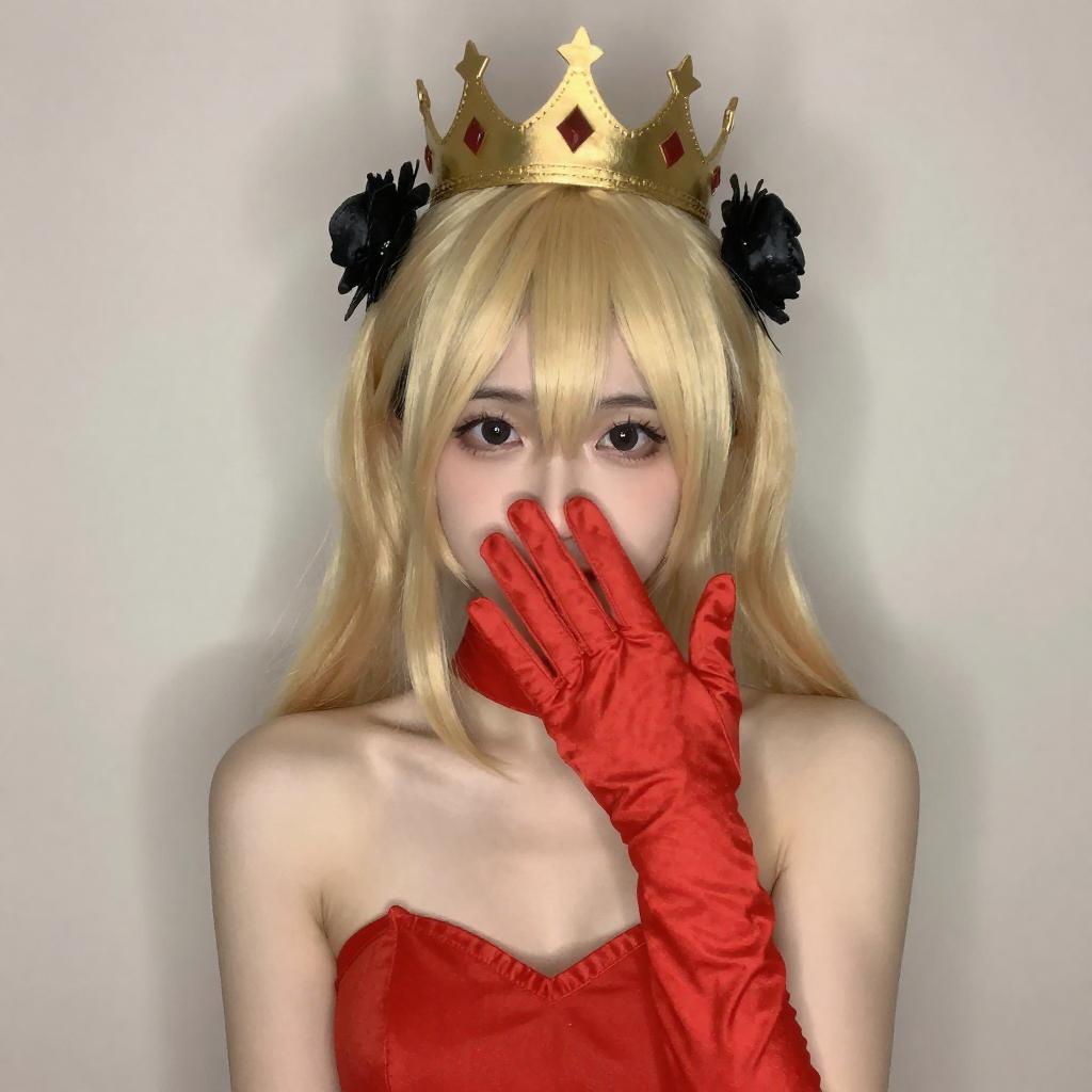 Photograph of a person cosplaying as a regal character with a golden crown adorned with black and red accents. They have blonde hair, pale skin, and red face paint. They wear a red, crisscrossing dress with a diamond gem at the chest and red, fingerless gloves. They are posing with one hand on their chest, smiling slightly. The background is a simple, bright white.