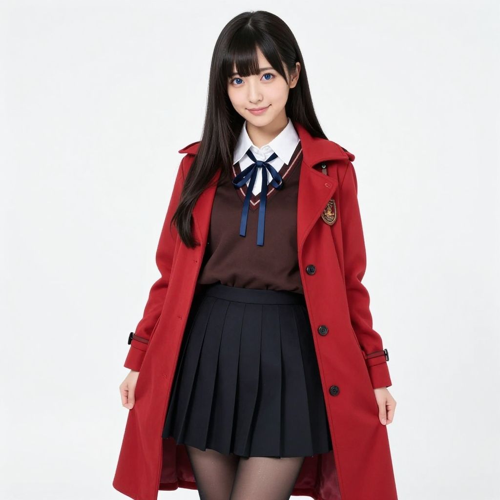 Photograph of an Asian woman with long black hair and bangs, standing against a white background. She wears a red trench coat with black buttons, over a white collared shirt, brown sweater, and black ribbon tie. She also has a black pleated skirt and black tights. Her hands are in her coat pockets, and she smiles gently at the camera. The image has a clean, studio-lit appearance, highlighting the contrast between her red coat and black skirt. The overall style is modern and professional.