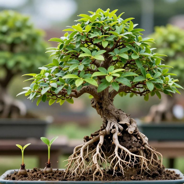 Bonsai tree from seed time lapse, stages of growth with roots expanding, tiny leaf buds emerging, detailed textures on miniature trunk, vibrant green foliage, subtle background blur, artistic focus on gradual development, natural, peaceful garden atmosphere.