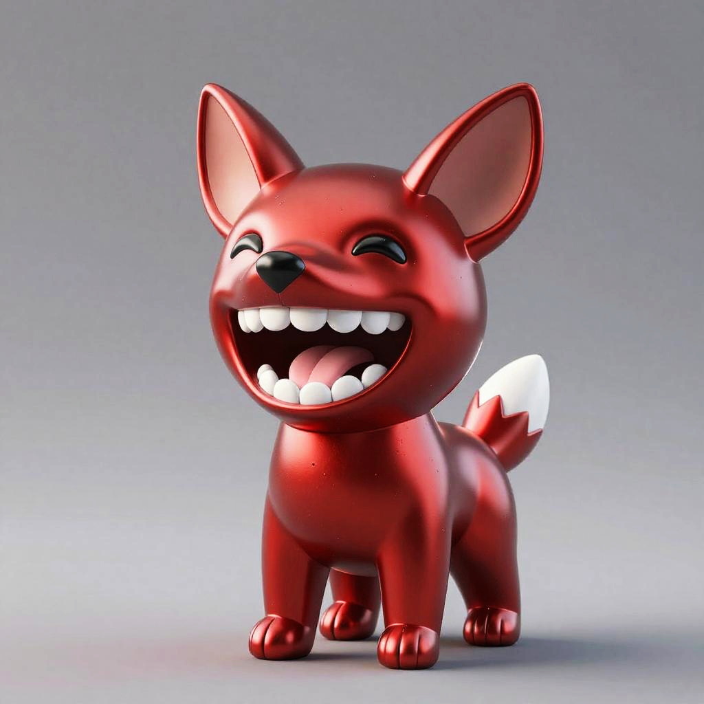 A shiny, metallic red plushie Jackal with a cute, chubby body and a wide-open mouth filled with white, rounded teeth and a pink tongue. Its eyes are small and slightly closed, and it has a small fin-like structure on its back. The background is a simple, gradient gray, highlighting the creature's glossy texture and vibrant color. The overall style is whimsical and playful.