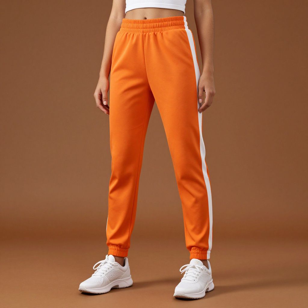 "Woman Track Pants, a woman in an orange track suit stands in front of a brown background"