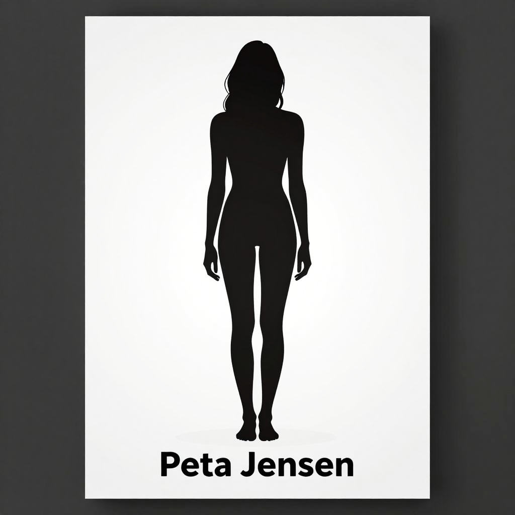 Minimalist poster showing Peta Jensen height in silhouette form, clean lines and shapes, monochrome background with contrasting highlight, subtle gradient, sharp focus on figure proportions, elegant and modern design aesthetic