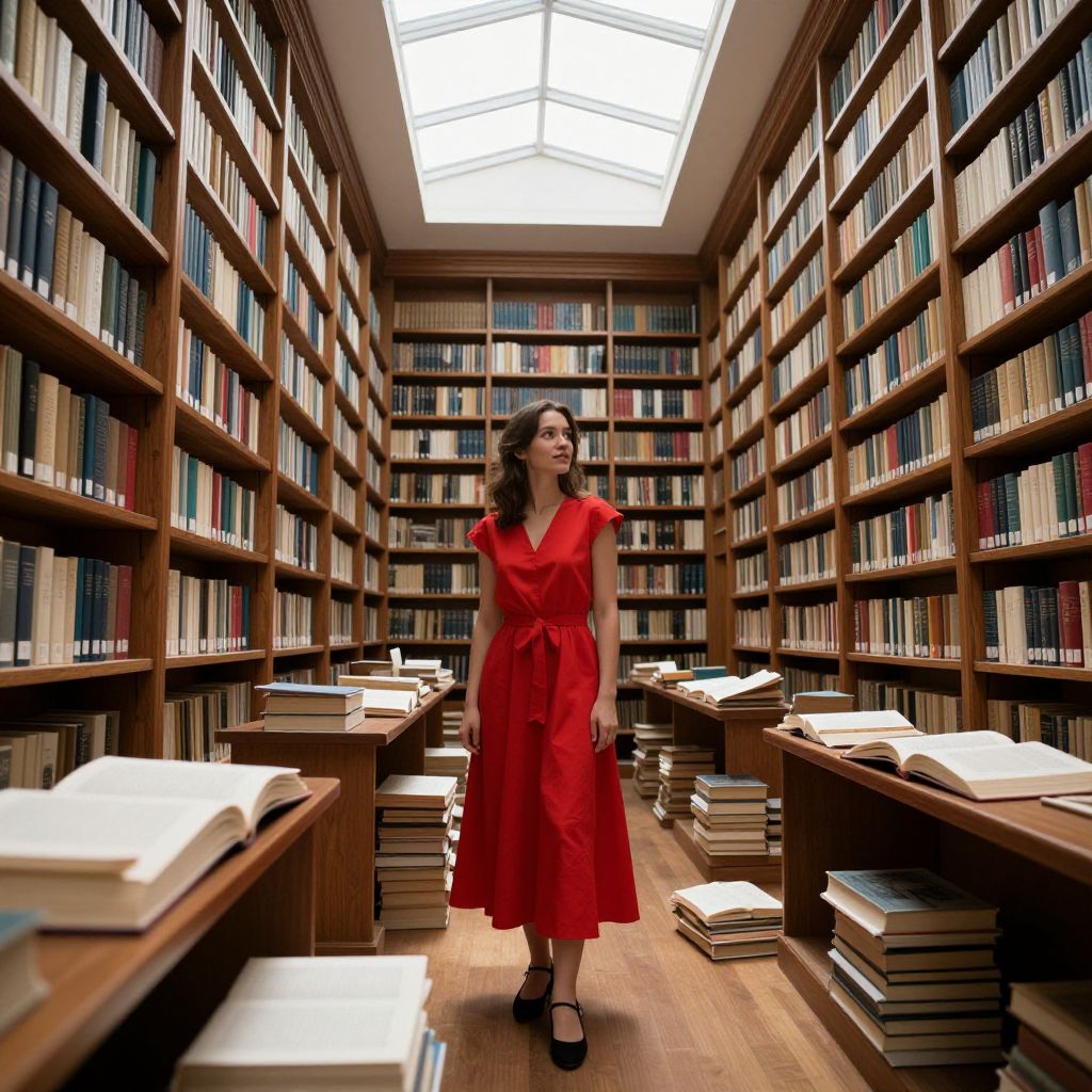 Photograph of a woman with wavy brown hair standing in the center of a narrow, well-lit library aisle. She wears a vibrant red, sleeveless, knee-length dress with a bow at the waist, and black high-heeled shoes. The library features tall wooden bookshelves filled with books on both sides, and stacks of books on the wooden floors below. The ceiling has a large, triangular skylight that allows natural light to illuminate the scene, creating a warm, inviting atmosphere. The woman gazes slightly to the side, adding a sense of contemplation to the image.