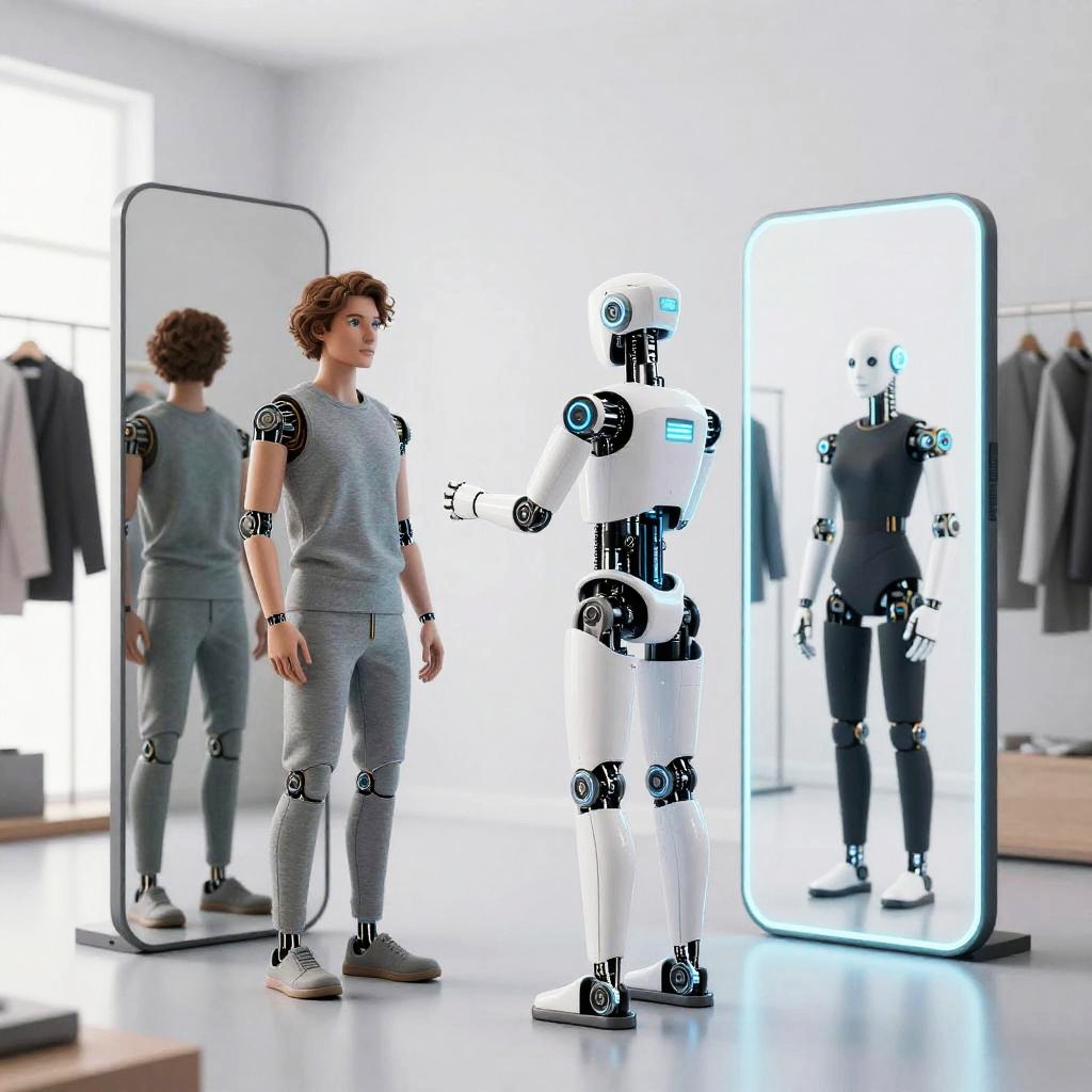 AI change clothes visualization, robotic assistant helping a human select and alter outfits instantly, augmented reality mirrors reflecting wardrobe options, sleek tech wear, minimalistic modern interior, bright and engaging environment