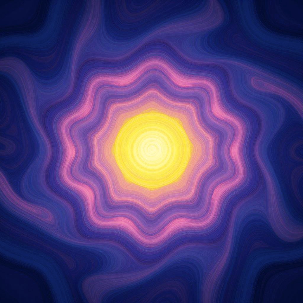 This is a vibrant, digital art piece featuring swirling, wavy patterns in deep blue, purple, and pink hues. The patterns create a tunnel-like effect that converges towards a bright, glowing yellow sun at the center. The textures are intricate, with the colors blending and highlighting the waves' contours, giving the image a dynamic, almost hypnotic feel.