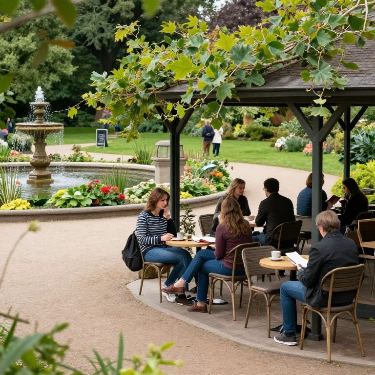 A quiet corner of a leisure park with a cozy café, where people relax with coffee and books, surrounded by gentle garden paths and the gentle sound of a nearby fountain, offering a peaceful retreat from the hustle and bustle.