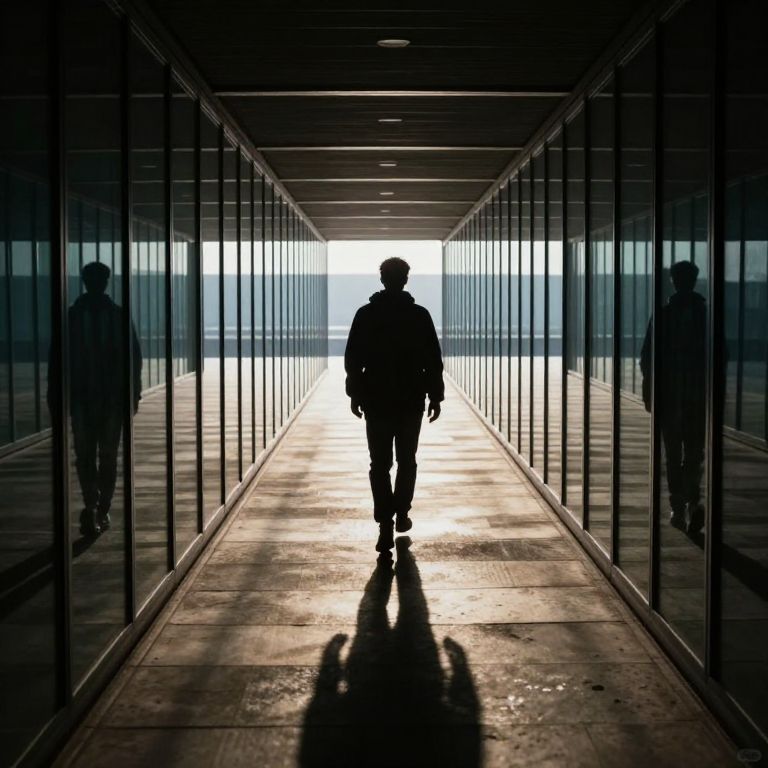 Silhouetted man in hooded jacket walks through a reflective, glass-walled corridor, with bright light at the end, creating a dramatic,