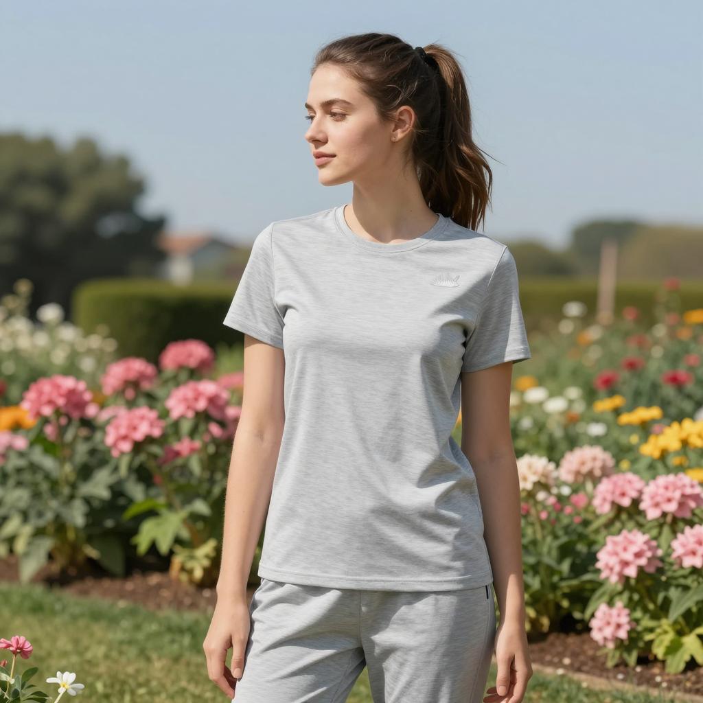 Jersey outfit woman, photorealistic portrait of a young woman standing in a colorful garden, wearing a white and navy blue sports shirt with red side panels and black athletic shorts, light brown hair, red lipstick, green eyes, wearing a black watch on her left wrist, bright sunlight, vibrant pink, yellow, and red flowers in the background, slightly blurred greenery, daytime, confident expression, casual attire, summer setting, clear sky, natural light, realistic ures, warm and cheerful mood