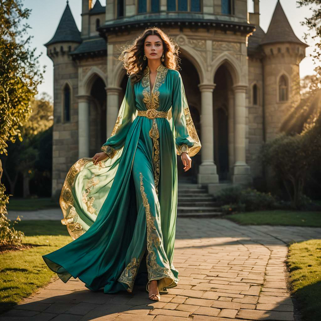 Portrait of a woman with long wavy hair, wearing an elaborate celadon green medieval-style robe with gold ornate trim. The flowing fabric and intricate details on the high collar, long sleeves, and belt showcase a graceful, fantasy-inspired fashion. She walks confidently on a cobblestone path in soft dramatic sunlight near stone arches and castle-like towers, evoking a mystical and regal aura.