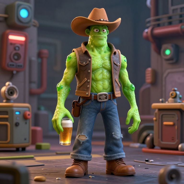 Trending On Artstation green slime humanoid, handsome, full body, country casual outfit, holding a beer, cyber diesel punk apartment background, 8K, ultra detailed, d&d style,
