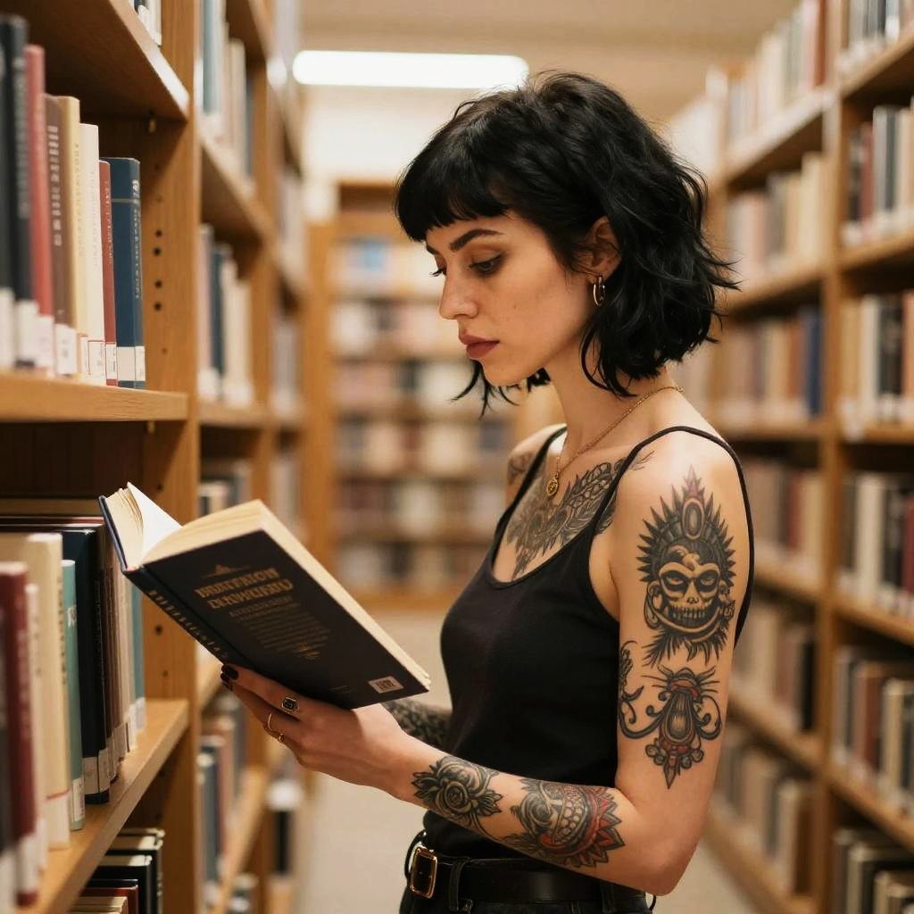 A woman with intricate arm tattoos and short black hair reads a book in a warmly lit library aisle. The image showcases a striking contrast between her modern, edgy appearance and the classic, scholarly environment. The photo is composed with a shallow depth of field, focusing on the woman's contemplative expression and detailed tattoo artwork.