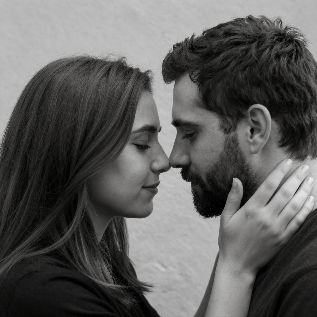 Close-up portrait of a shirtless man and woman in an intimate embrace. The man, with light skin and dark hair, gently holds the woman's face with his right hand. The woman, with medium brown skin and long dark hair, has her eyes closed and lips slightly parted. Both have a tender, serene expression, conveying deep emotional connection. The background is neutral and blurred to keep focus on the couple.