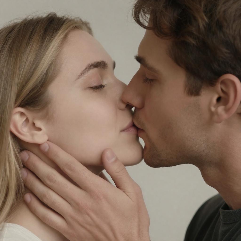 Photograph of a shirtless man and woman in a close embrace. The man, with light skin and dark hair, holds her face gently with his right hand. The woman, with medium brown skin and long dark hair, has closed eyes and slightly parted lips. The man's face is close to her cheek, eyes closed. Background is blurred and indistinct.