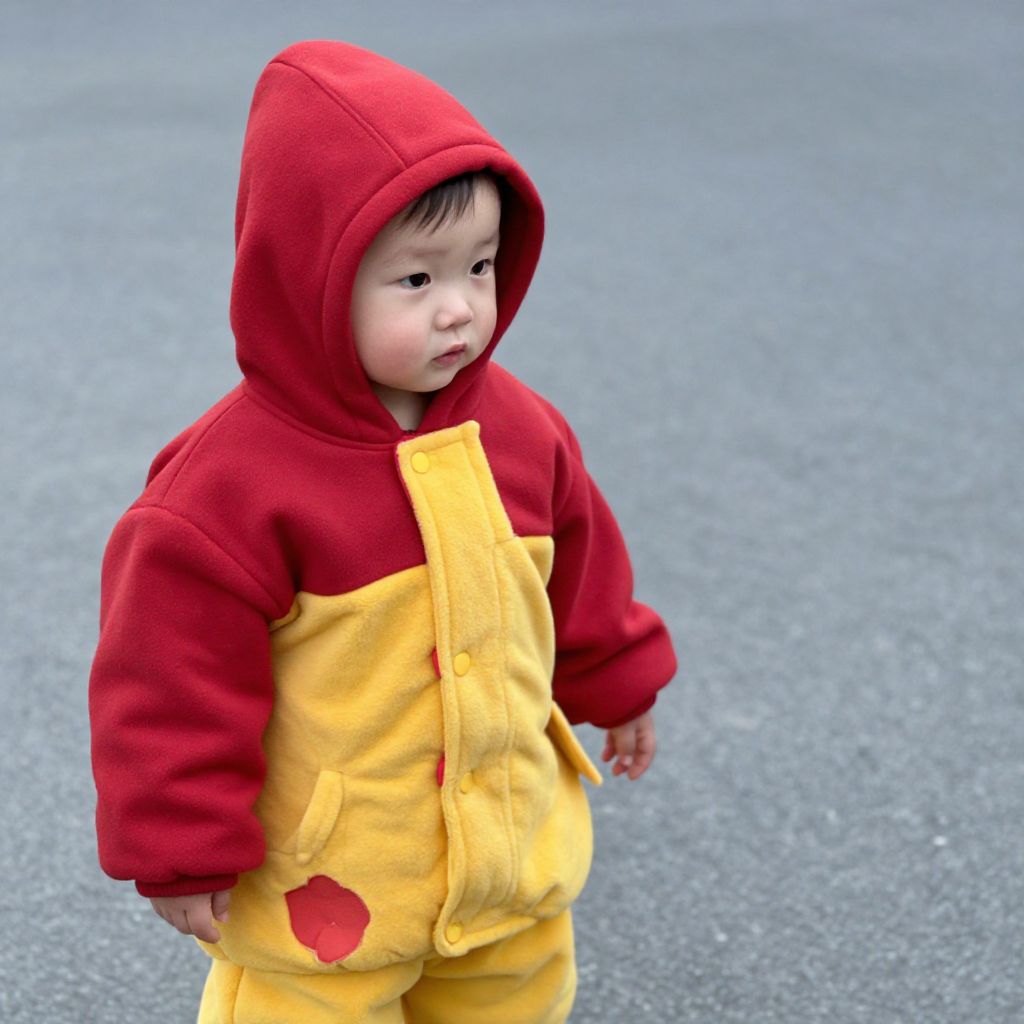 A young child is wearing a red and yellow outfit with a hood. The child is standing on a street.