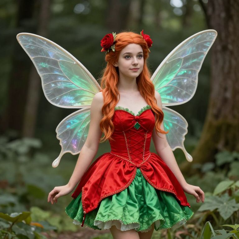 Photograph of a fair-skinned, red-haired fairy with glowing wings, wearing a red and green dress, in a forest setting.