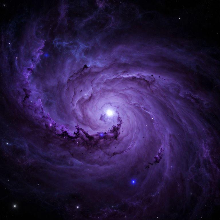 Dark purple swirling nebula in deep space, vibrant stars sparkling, cosmic clouds blending shades of violet and indigo, mysterious and serene atmosphere, high detail, digital art style