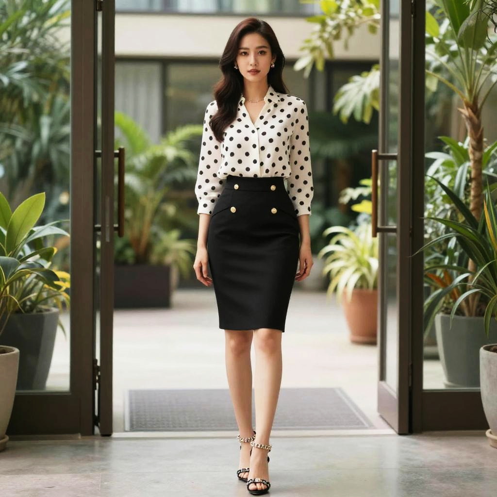 A woman in business chic attire, wearing a white blouse with black polka dots and a black pencil skirt with gold button details, stiletto sandals with jewel embellishments, standing in an indoor botanical garden entrance, captured in a studio bones visual style. Sexy. Pretty face and beutiful eyes