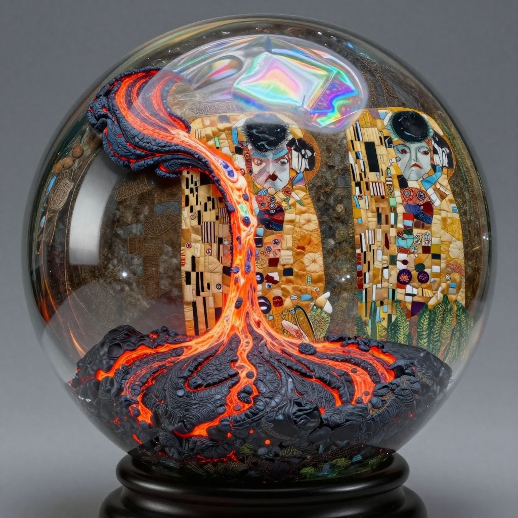 Photograph of a glass snow globe with a colorful, intricate interior. The globe features a vibrant, molten lava flow in bright orange and red, winding through dark, textured rock formations at the bottom. In the background, there are two buildings with a mosaic, Art Nouveau-style design, featuring gold, yellow, and green tiles with blue and white accents. The glass is clear and reflective, capturing light and creating a sparkling effect. The globe sits on a black, rounded base. The overall style is a blend of surrealism and Art Nouveau.