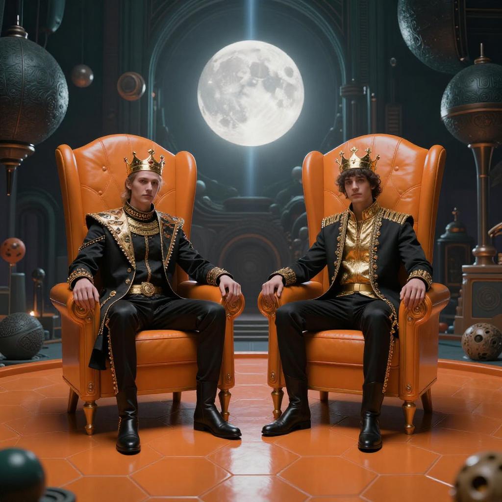 Two men dressed as futuristic kings with black and gold attire, sitting on large orange thrones in a surreal, otherworldly setting. The scene features a glowing full moon with a vertical light beam, and a backdrop of textured spherical and architectural elements in dark teal and black tones. The floor is tiled with a bright glossy hexagonal orange pattern, creating a striking contrast with the surroundings.