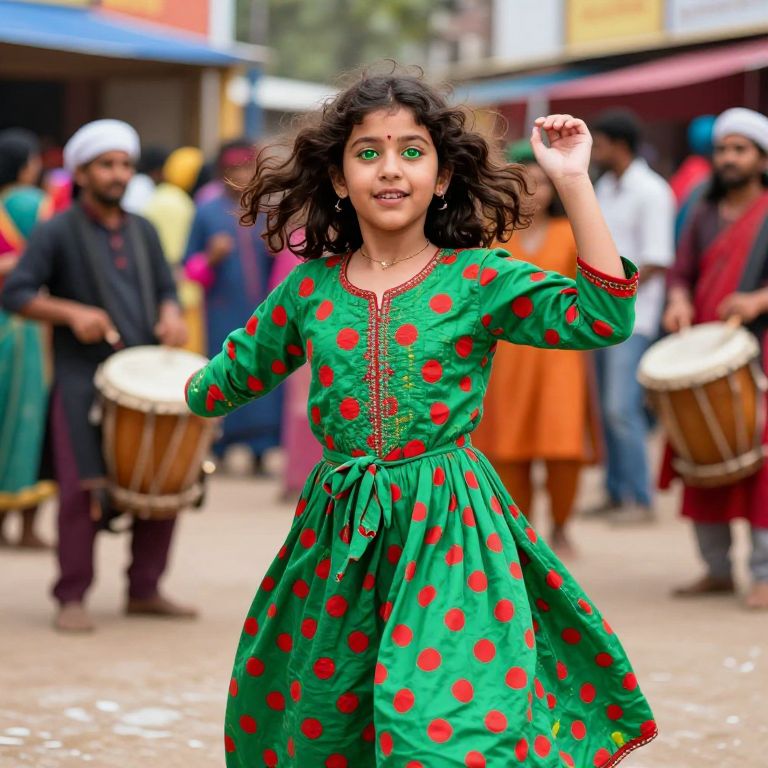 A dynamic photo of a young girl with curly brown hair and bright green eyes, wearing a playful green salwar kameez with bright red polka dots and tied at the waist, dancing in a crowded neighborhood festival with drums, folk music, and colorful crowds in the background.