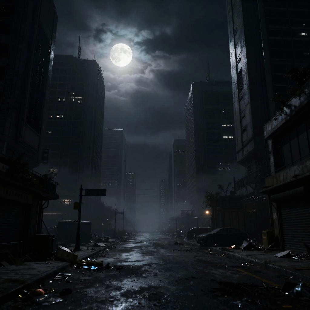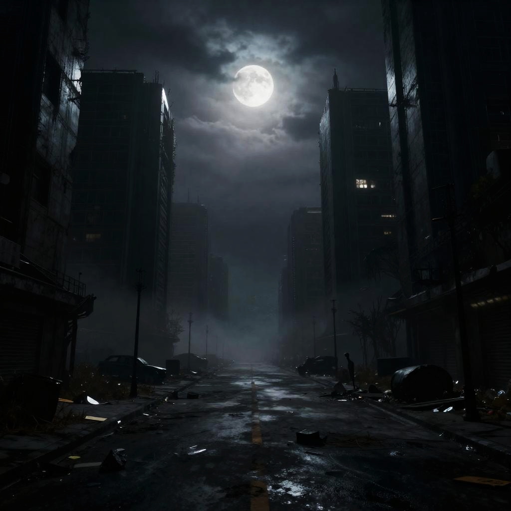 ((best quality)), (masterpiece), photorealism, realistic, real life, uhd, 8k, to8contrast style, dark scenery, rtx, ray tracing, atmospheric fog, moonlight, futuristic city, dirty streets, trash, run down buildings, (postapocalyptic city:1.3), dark clouds