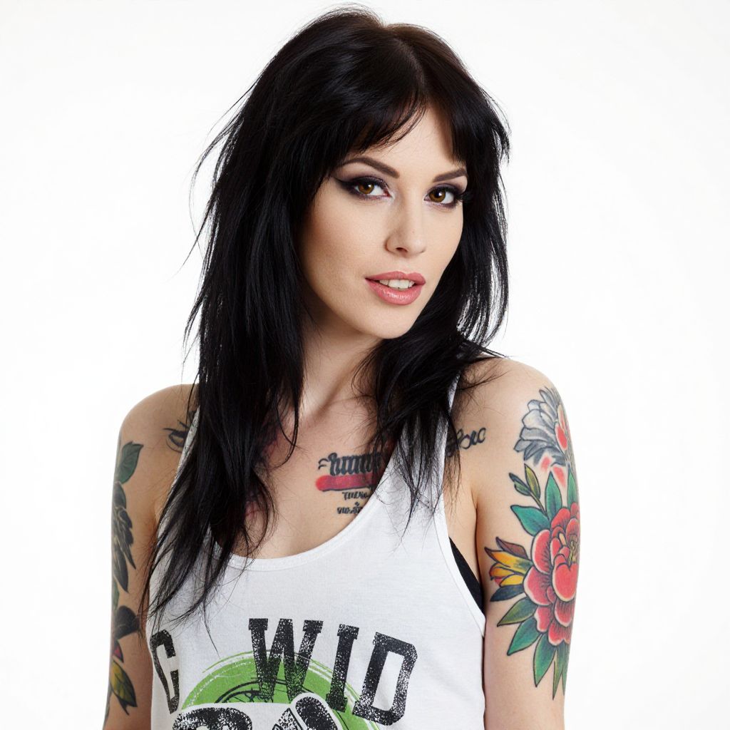 Photograph of a tattooed woman with long, dark brown hair and pale skin. She's posing with one arm raised, hand touching her head, showing off colorful tattoos on her arm and shoulder. She has heavy black eyeliner, pink lipstick, and a slight, playful smile. She's wearing a black lace top, and the background is a simple, light gray.