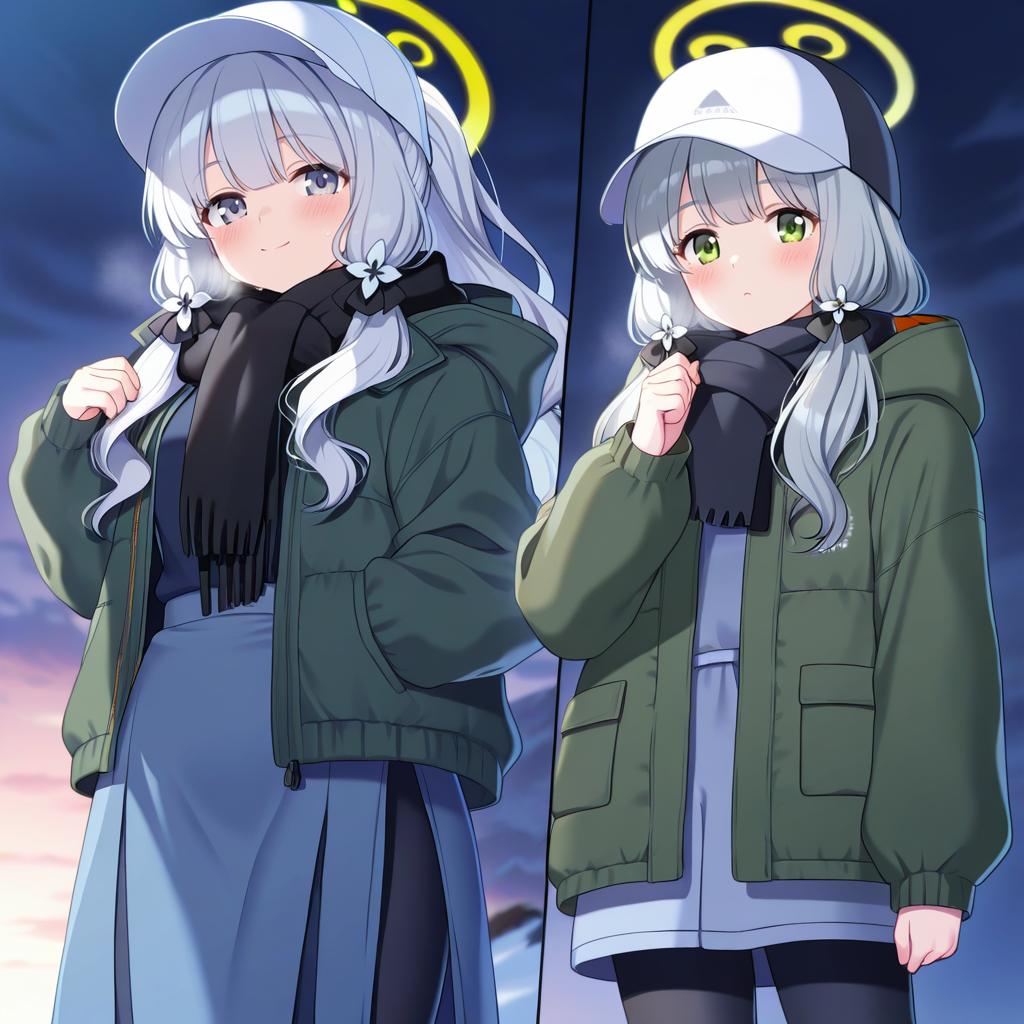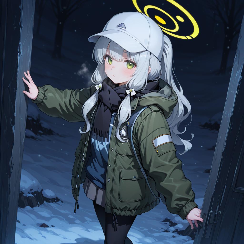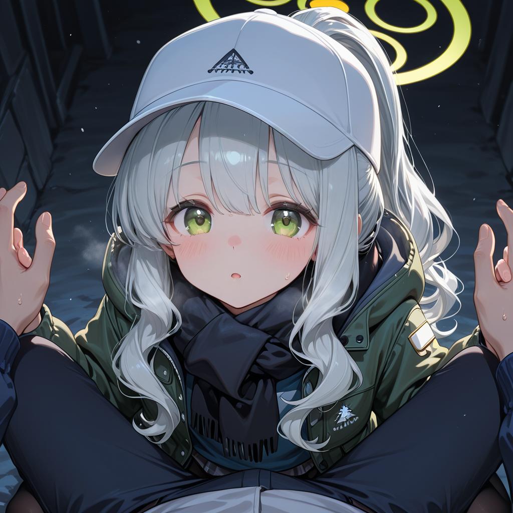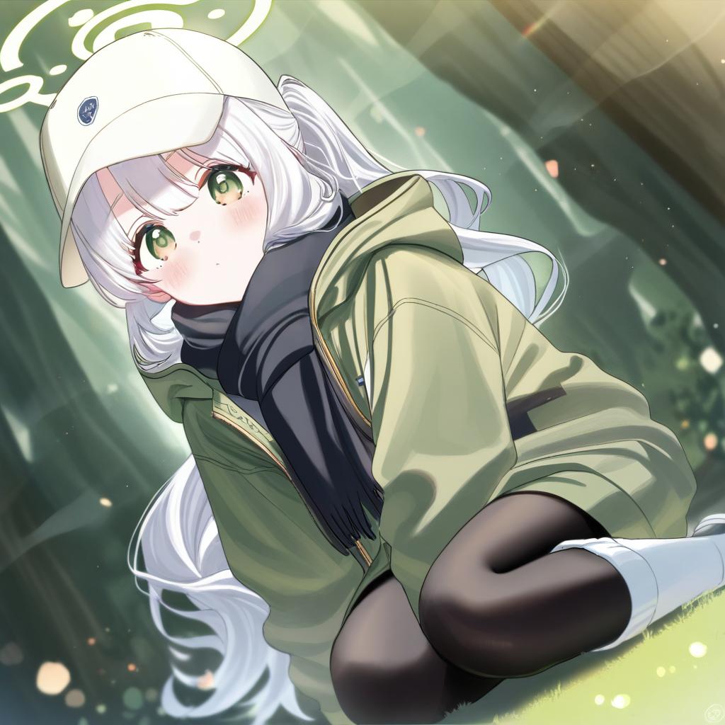 Hare (camp) (blue archive), blue archive, 1girl, green eyes, long hair, grey hair, ponytail, green jacket, white headwear, hooded jacket, open jacket, black scarf, hat, black pantyhose, halo, green halo, long sleeves, hood down, white hat, by artist atg (wttoo0202), illustrious