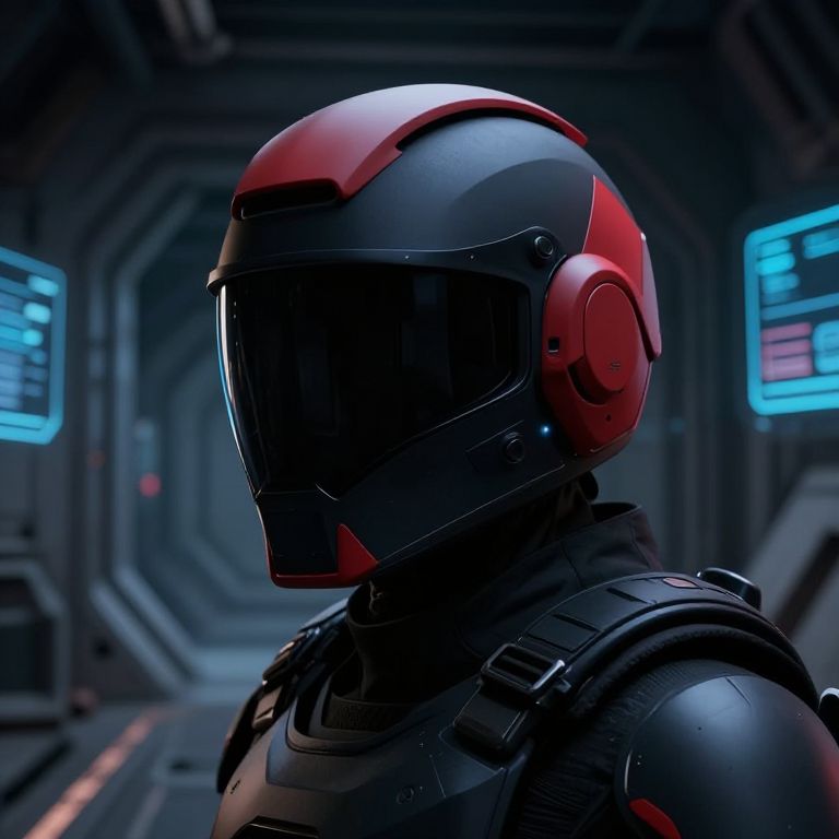 CGI image of a futuristic astronaut with a red and black helmet, dark visor, and armored suit in a dimly lit, high-tech corridor