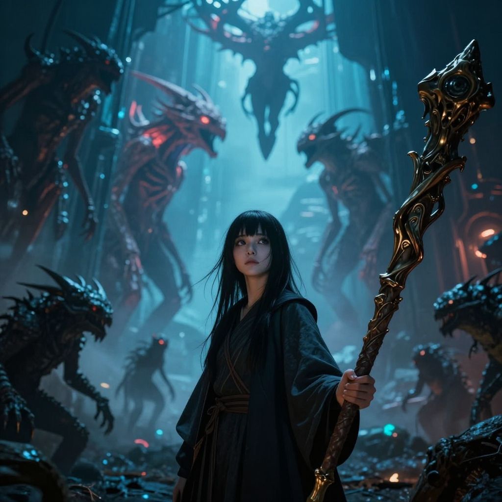 Digital artwork of a dark-haired, serious young woman with black robes, holding a glowing staff, surrounded by menacing, glowing-eyed creatures in a misty