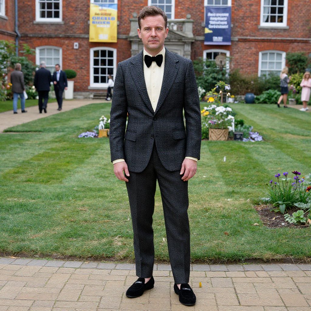 A man, muted grey and black tartan dinner jacket, ivory dress shirt, black velvet bow tie, charcoal tailored trousers, sleek black loafers, historic brick architecture, lush green gardens, community event banners, 3M ferrania analog film stock, confident expression. Man has masculine face and piercing eyes
