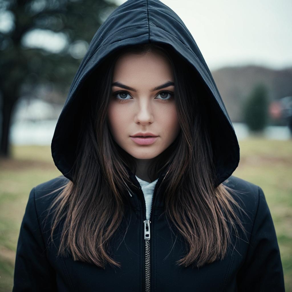 Yellow costume,1girl, solo, long hair, looking at viewer, realistic, blonde hair, blurry background, blurry, hands in pockets, hood, closed mouth
