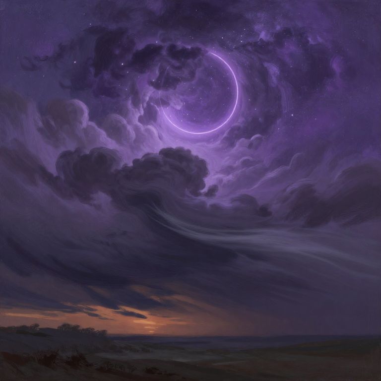 An ethereal oil painting illustration depicting a dramatic storm brewing under a glowing crescent shape in a purple, starry sky. Dark, swirling clouds form a circular pattern above a desolate landscape at sunset, enhanced by textured brushstrokes and moody lighting, creating a mysterious and intense atmosphere.