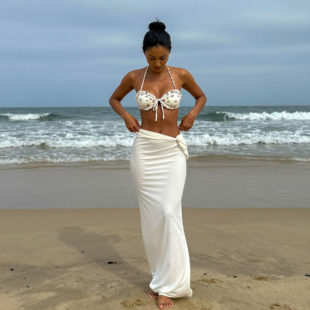 Woman with tan skin and black hair in a bun stands on a beach. She wears a white, floral-braided bikini top and a long, white, floor-length skirt. Ocean waves in the background, cloudy sky overhead. She looks down, adjusting her top. Sand-covered beach, sea in the distance. Single person, standing, looking down, adjusting top.