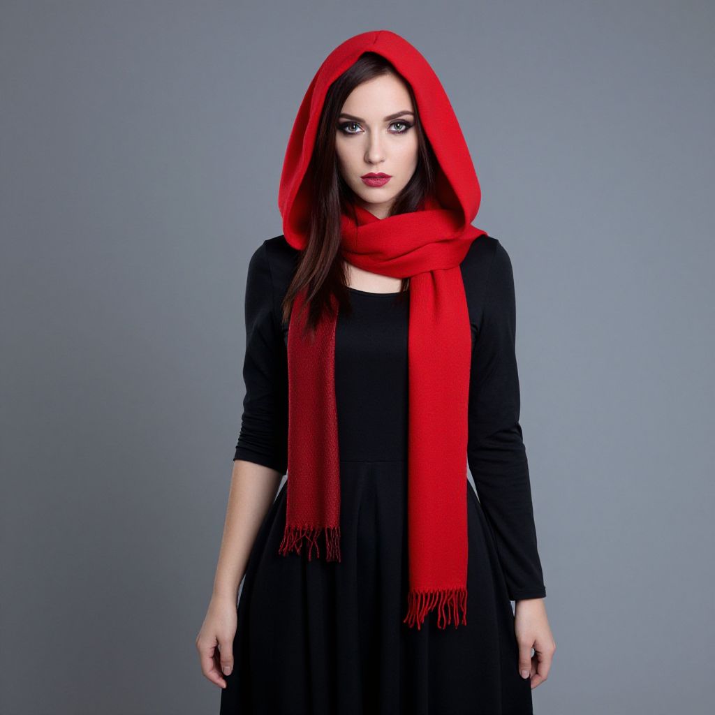 Photograph of a pale-skinned woman with dark brown hair, red lipstick, and black, long-sleeve, V-neck dress with hood,