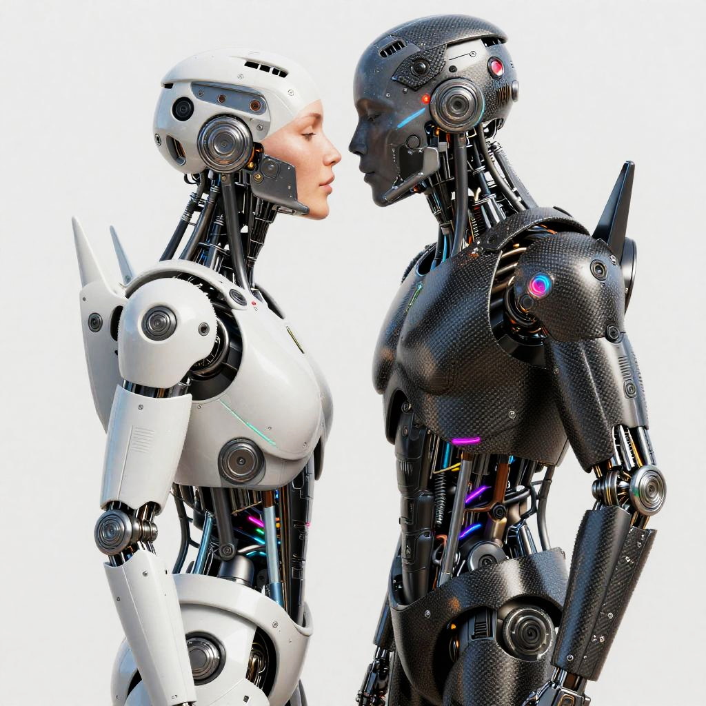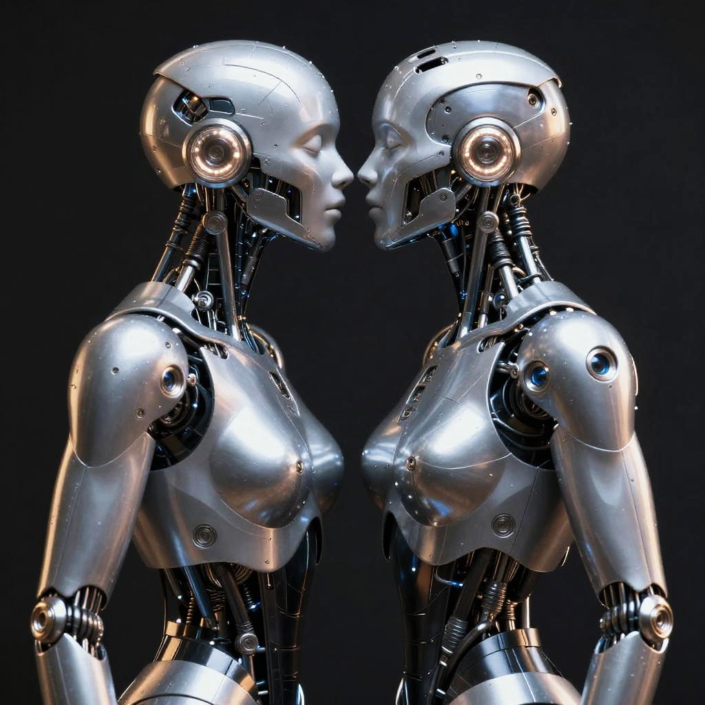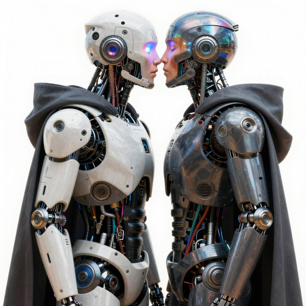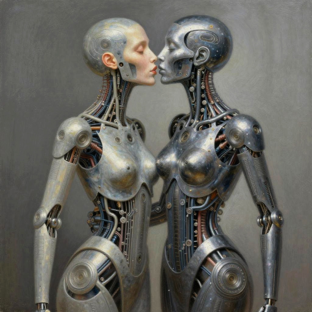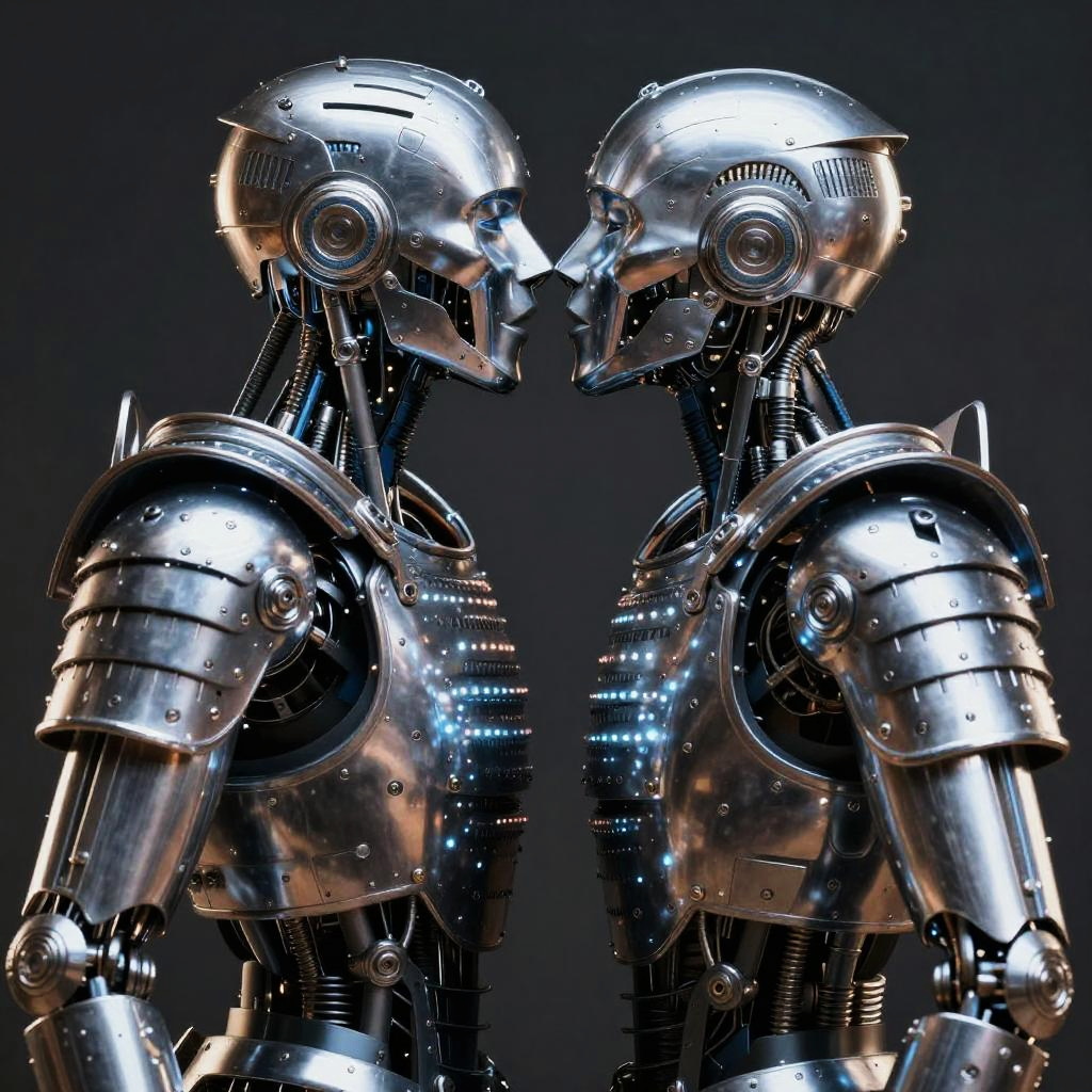 Portrait of two half-human, half-robot figures kissing, wearing chrome plated cyber samurai armor with LED accents, in the style of Edward Hopper, highly detailed
