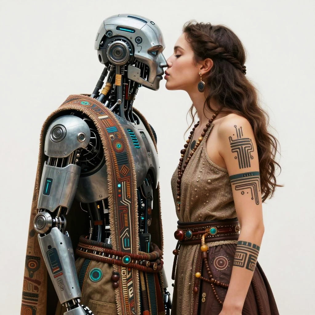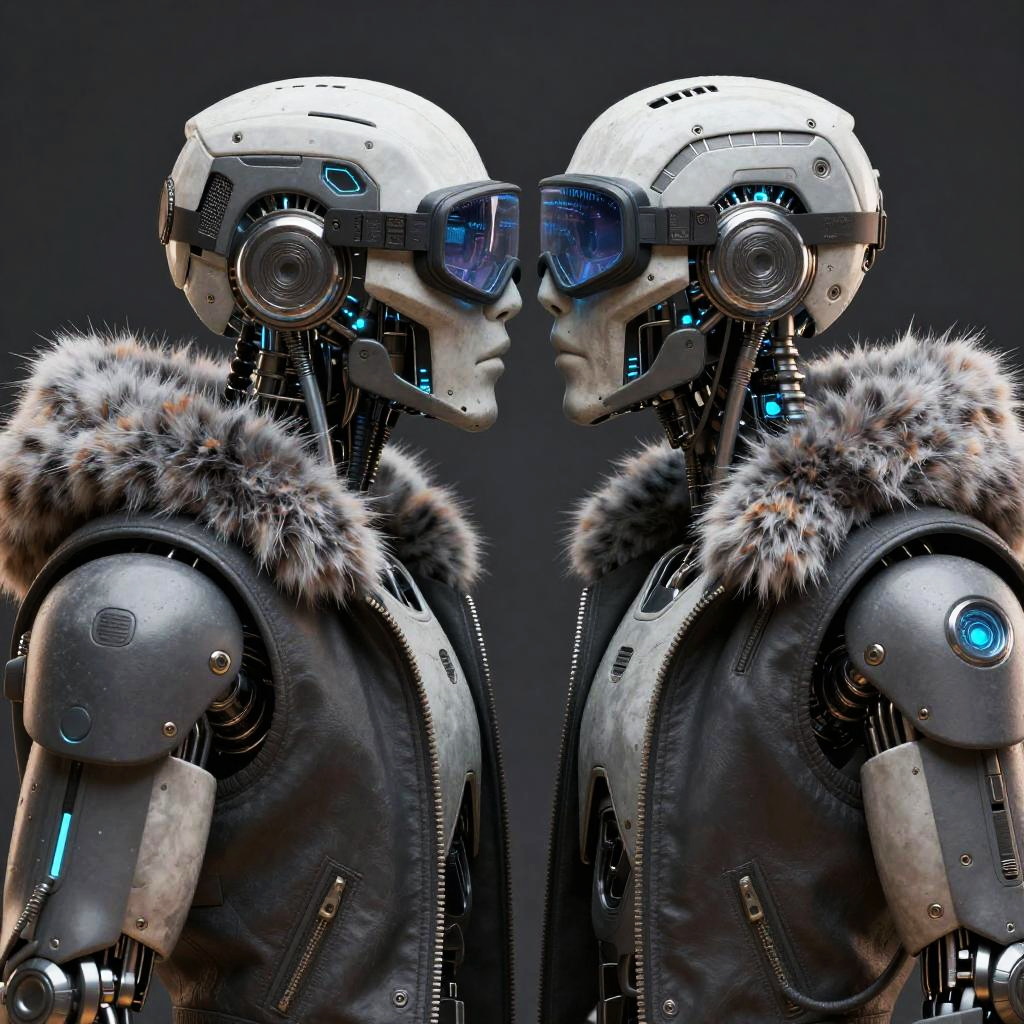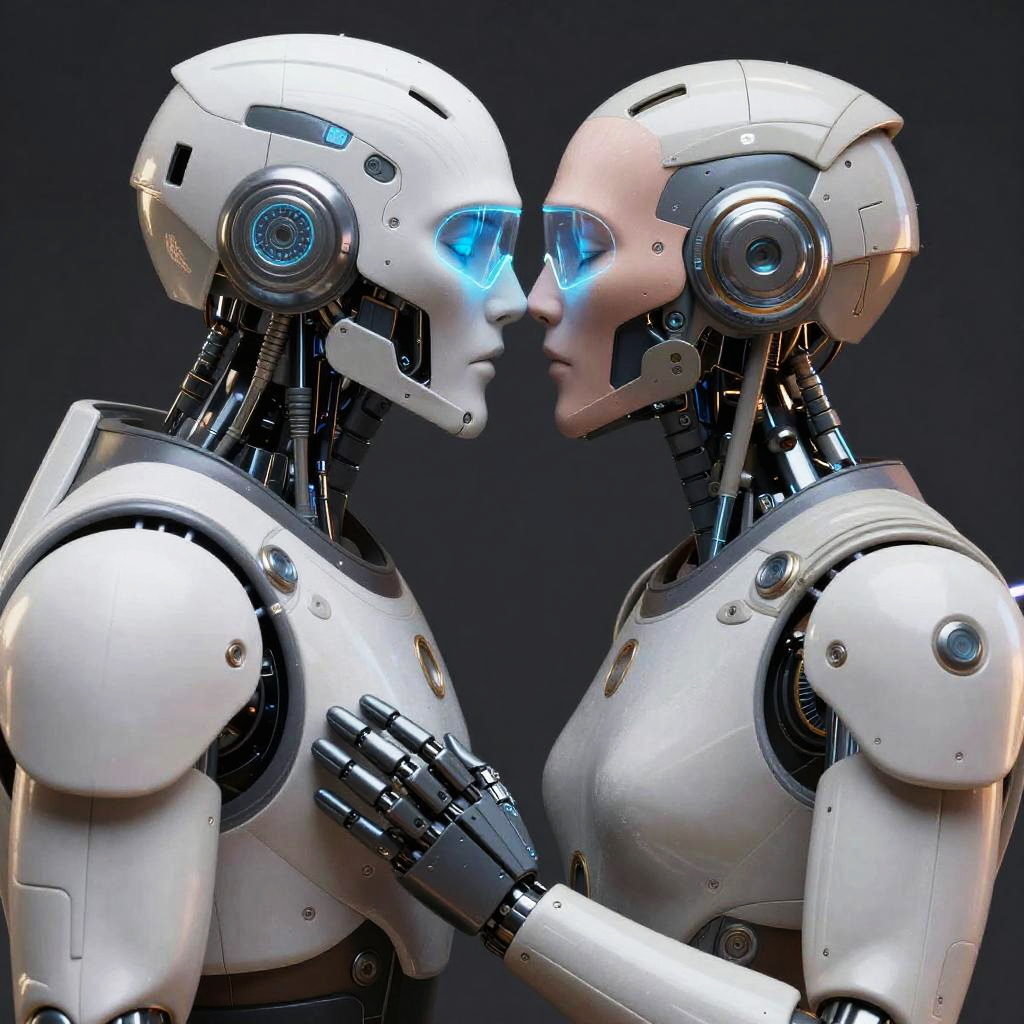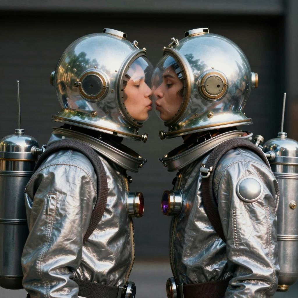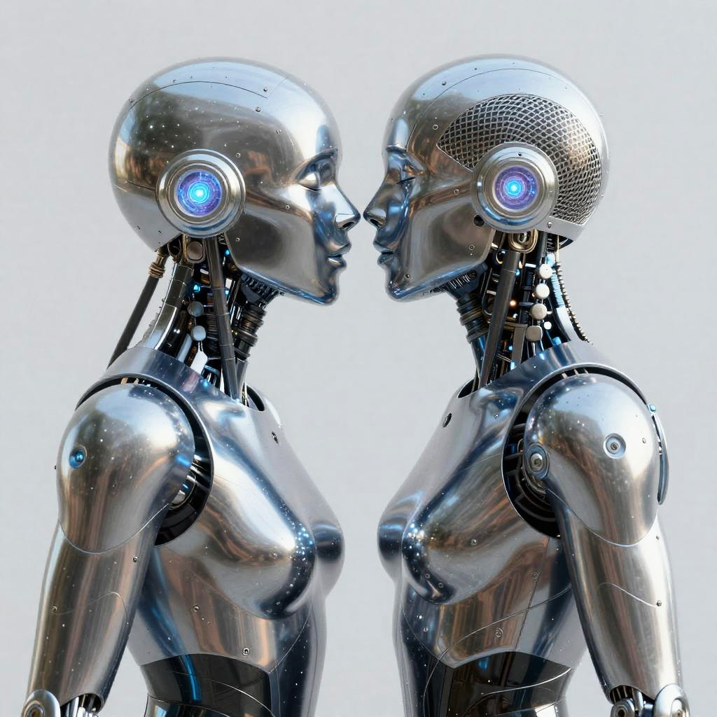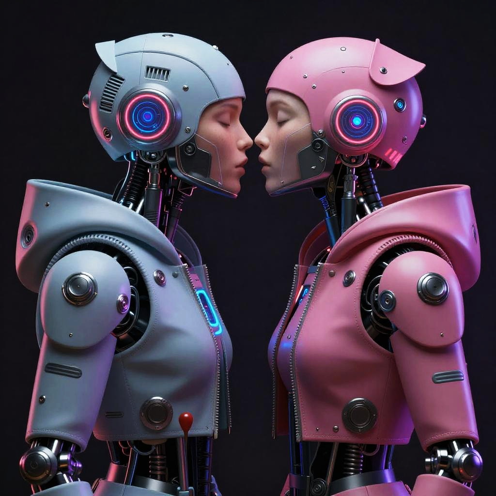 Portrait of two half-human, half-robot figures kissing, wearing chrome plated cyber samurai armor with LED accents, in the style of Edward Hopper, highly detailed