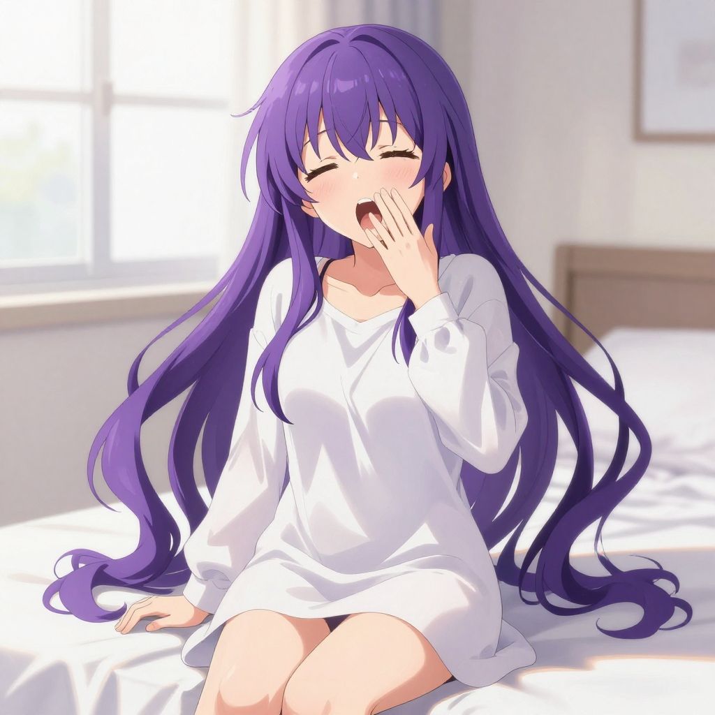 A digital illustration of an anime-style girl with long, flowing purple hair sitting on a bed. She is wearing a loose, white long-sleeve dress and appears to be yawning or waking up, with one eye closed and hand near her face. The background shows a bright room with light curtains and white bedding illuminated by natural sunlight.