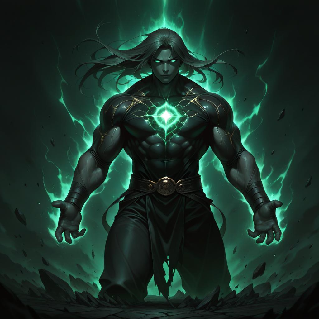 Masterpiece, best quality, ultra high res, beautiful, visually stunning, elegant, incredible details, award-winning painting, (dark art:1.1), deep shadow, (dark green theme:1.2), r1ge, glowing, aura, energy, beam, flying debris, [serious|angry], floating hair, 1boy, muscular