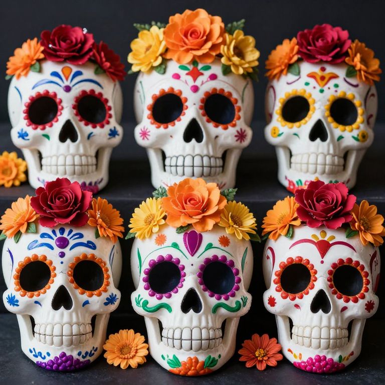 Photograph of five colorful sugar skulls adorned with orange and red flowers, featuring intricate floral and dot patterns on white backgrounds.
