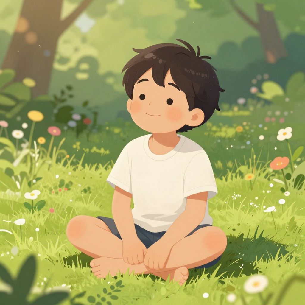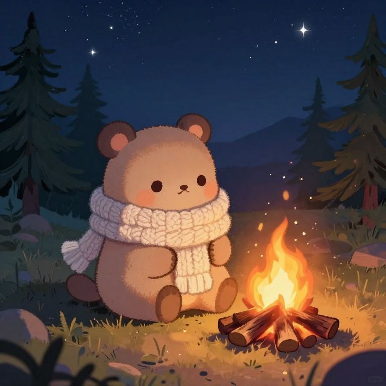 Fella, a whimsical cartoon figure with exaggerated features, playing guitar by a campfire in a forest clearing, warm glowing embers, starry night sky above, cozy atmosphere, colorful and playful art style.