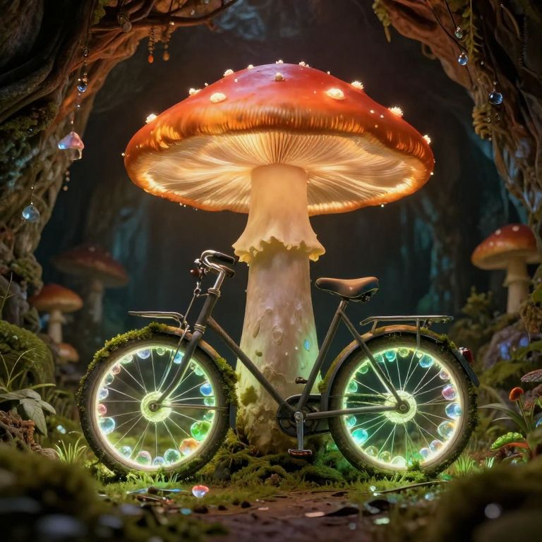 A whimsical digital artwork depicts a fantastical underground cavern where a bicycle, adorned with mossy tires and glowing crystal wheels, leans against a towering mushroom with spiky orange cap, evoking a surreal blend of nature and enchantment.