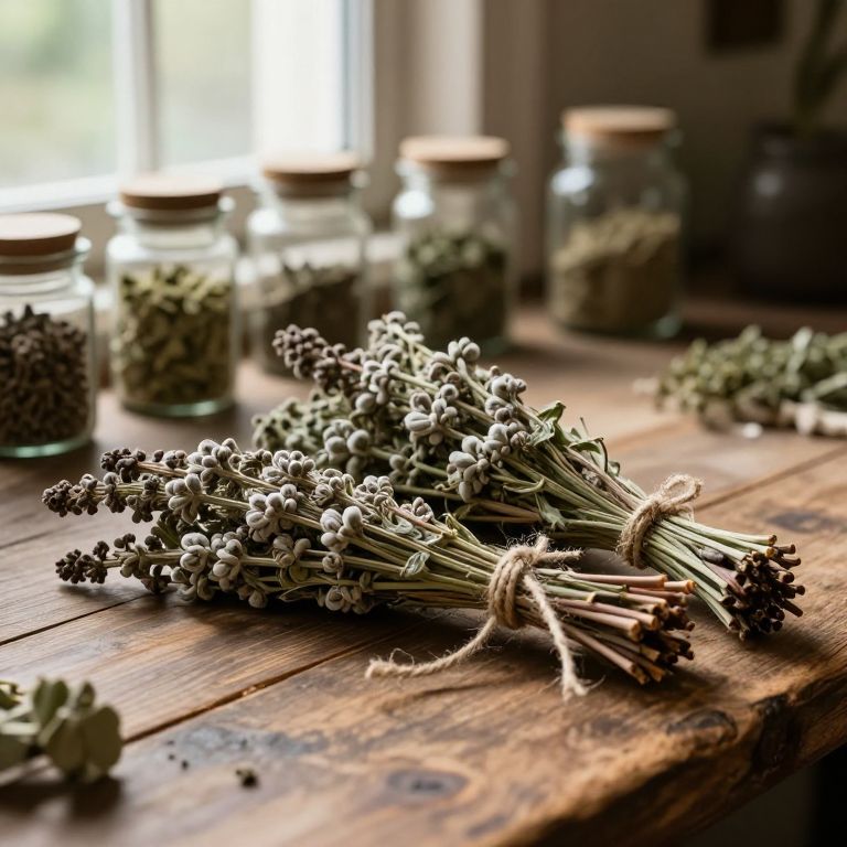 Photograph of a rustic wooden table with a bouquet of dried lavender tied with twine in the foreground. In the background, there are several glass jars with wooden lids, each filled with dried herbs. The jars are slightly out of focus, with sunlight streaming in from a window on the left, casting a soft glow. The overall color palette features earthy browns and greens, creating a warm, cozy atmosphere. The lavender's tiny, grayish-purple buds contrast with the rough texture of the wooden table.