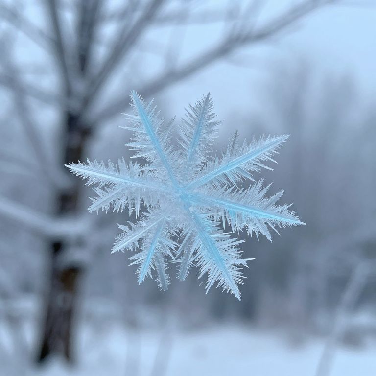An ultra-detailed macro shot of ice crystals suspended in a clear winter mist, showing translucent pale blue hues with crisp, sharp textures, the ice forming intricate patterns in the air, set against a snowy forest background with frost-laden tree branches and a soft bluish sky.