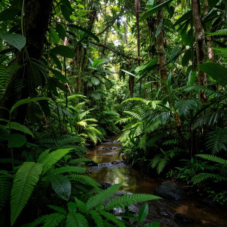 The image depicts a lush, paracitic jungle scene that exudes a sense of realism and depth. The dense foliage, characterized by vibrant green leaves and a variety of plant species, fills the frame, creating a rich tapestry of textures and shapes. A winding, shallow stream cuts through the center, reflecting the dappled sunlight filtering through the canopy above. The interplay of light and shadow adds depth, highlighting the intricate details of the plants and the moisture on the ground. The overall composition is balanced, with the stream serving as a central axis that draws the viewer's eye through the scene. The paracitic jungle's dense vegetation and the serene waterway create a tranquil yet dynamic environment, capturing the essence of a thriving, untouched natural landscape.