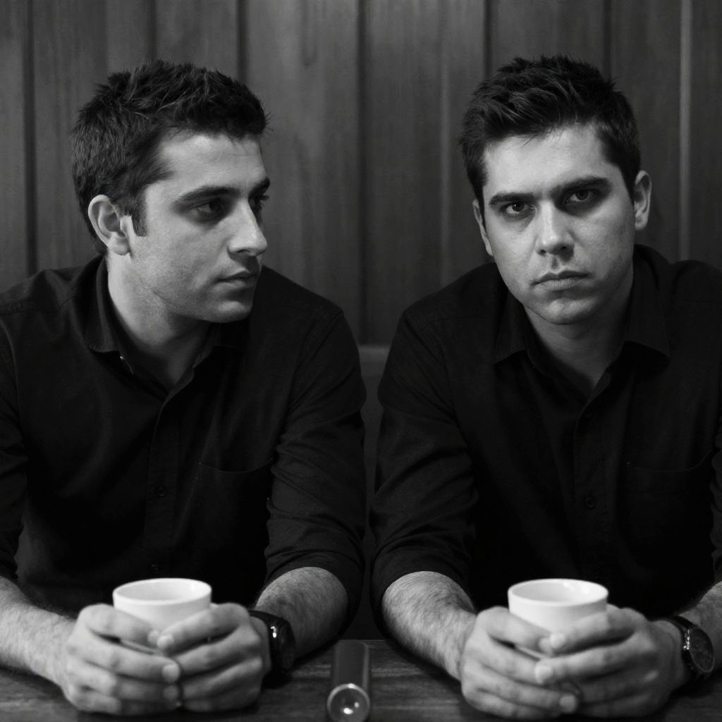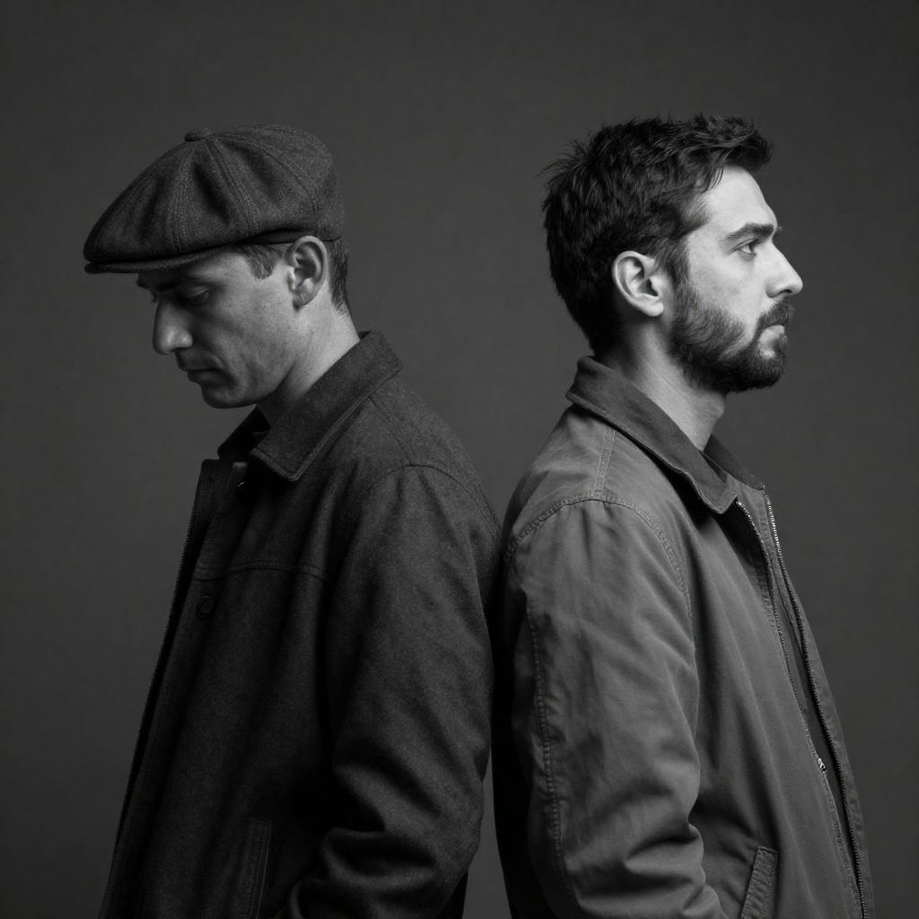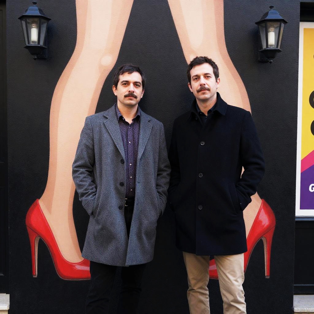 Photograph of two men standing in front of a black wall with large painted legs and red high heels. Both men have short, dark hair and mustaches. The man on the left wears a grey coat and patterned shirt, with hands in pockets. The man on the right wears a black coat over a dark shirt and beige pants. The wall features two wall-mounted lanterns and a colorful poster on the right. Both men have neutral expressions.