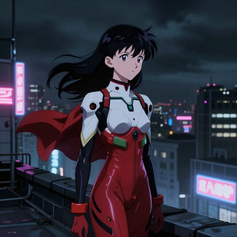 A moody, atmospheric scene of Misato Katsuragi in her Evangelion misato outfit, standing on the edge of a rooftop overlooking a dark, stormy cityscape at night, her face illuminated by a flickering neon sign, the red and white outfit standing out against the shadows, wind lifting her jacket slightly, capturing tension and emotional depth in her expression.