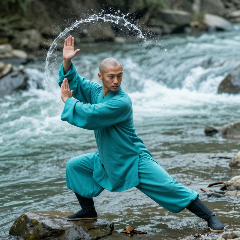Paper a shaolin monk wearing turquoise practicing water martial art in a river , spiral of water drops in his back, motion , wind , action pose,