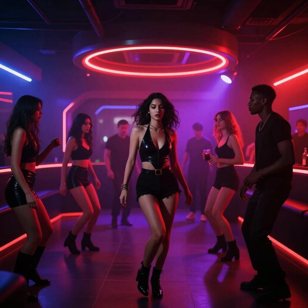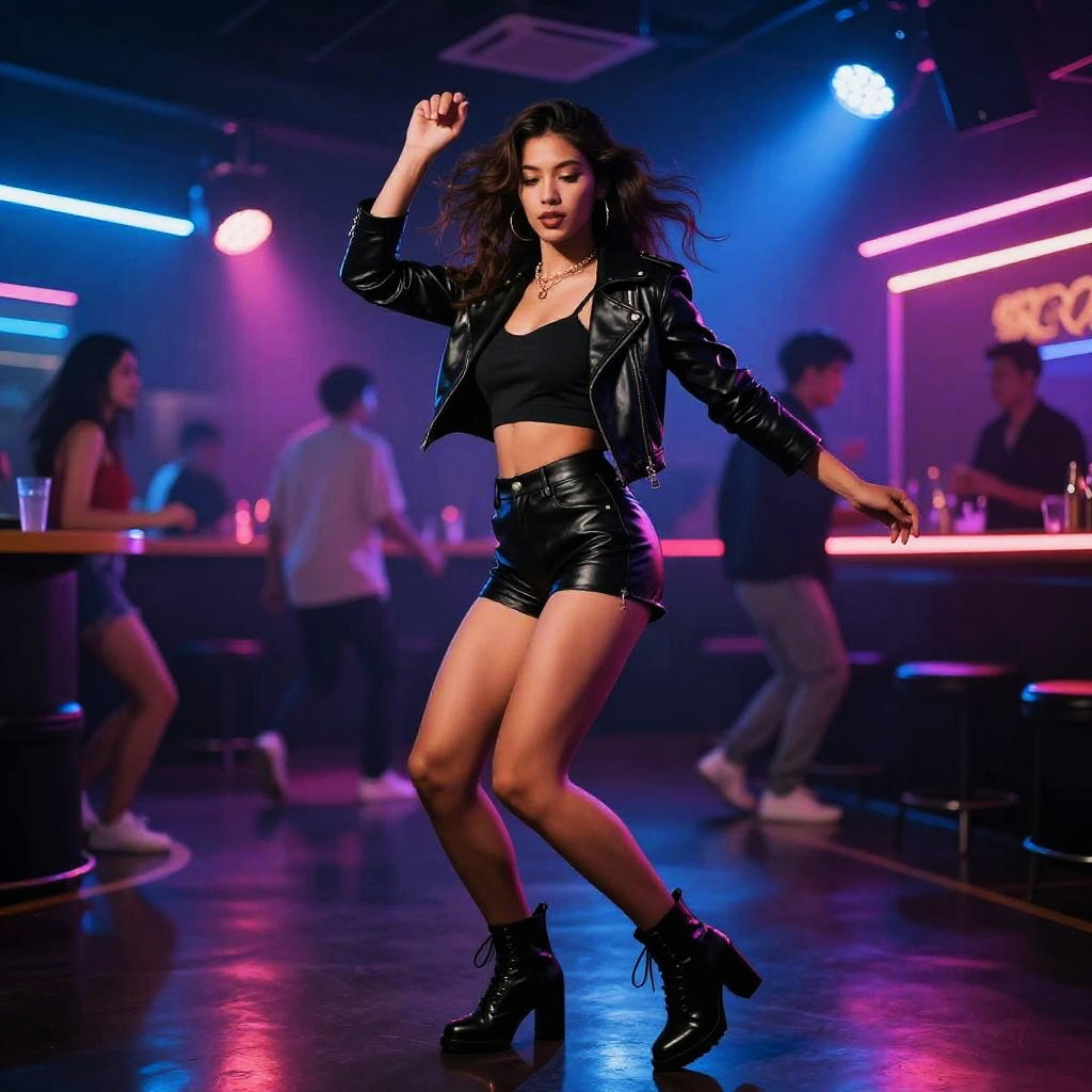 Dancing provocatively in a dimly lit nightclub, vibrant neon lights reflecting off glossy floors, dynamic motion blur, expressive body language, high fashion urban attire, cinematic atmosphere, ultra realistic